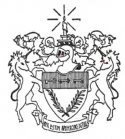 College Fraternity Heraldry described Alpha Delta Theta's coat-of-arms as "argent; on a chief gules three keys of the first per fess, in base two palm branches saltirewise vert. Crest. A candle argent in candlestick flared of the same. Supporters. Two unicorns proper". The motto, a Greek phrase, was written on a banner under the shield. This coat-of-arms was adopted at the national convention in 1928; it is based entirely on ritualistic symbolism.[9]