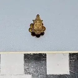 The Alpha Kappa Kappa badge was a gold crescent with the letters, Α, Κ, and Κ, enameled in black. Wrapped around the crescent are twin coiled serpents facing each other. The horns of the crescent support an enameled black book bearing the letter(s) of the chapter. (In the infobox, a photographic example shows a pin from the Mu chapter at the University of Pennsylvania.) The book may be set in pearls and emeralds, which were the fraternity's jewels. The name of the school was sometimes etched onto the side of the book, which was held at a diagonal.