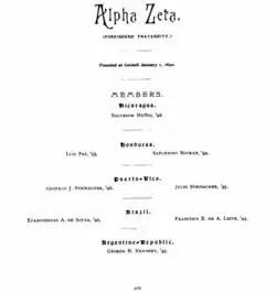 Alpha Zeta was founded at Cornell University on January 1, 1890.[1] In the fall of 1889, international Latin American students decided to establish a fraternity that would cater to their needs. Since traveling was more of a challenge in 1889–1890, during the winter break, the organization's founders stayed in Ithaca, New York. On New Year's Day in 1890, at a meeting on campus, the founders created the first Latin American student fraternity in the United States.[2]