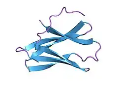 A crystal structure has been determined for tendamistat, the 74-amino acid inhibitor produced by Streptomyces tendae that targets a wide range of mammalian alpha-amylases.[3] The binding of tendamistat to alpha-amylase leads to the steric blockage of the active site of the enzyme. The crystal structure of tendamistat revealed an immunoglobulin-like fold that could potentially adopt multiple conformations. Such molecular flexibility could enable an induced-fit type of binding that would both optimise binding and allow broad target specificity.
