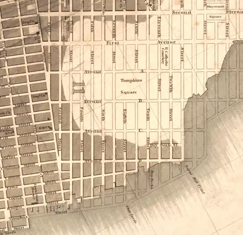 Alphabet City area as laid out in Commissioners' Plan of 1811. Note, the majority is depicted as marsh. Envisioned "Market Place" was never built, but the portion between Avenues A and B is now Tompkins Square Park. Long, shaded diagonals off North Street (now Houston) indicate rope making walks.
