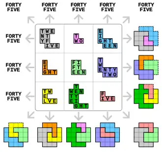 An alphamagic square is a magic square that remains magic when its numbers are replaced by the number of letters occurring in the name of each number. Hence 3 would be replaced by 5, the number of letters in "three". Since different languages will have a different number of letters for the spelling of the same number, alphamagic squares are language-dependent.[1] The term alphamagic was coined by Lee Sallows in 1986.[2][3]