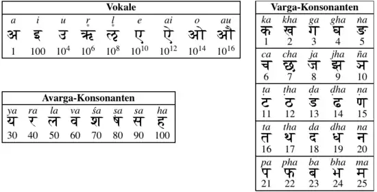 Alphasyllabic numeral systems are a type of numeral systems, developed mostly in India starting around 500 AD. Based on various alphasyllabic scripts, in this type of numeral systems glyphs of the numerals are not abstract signs, but syllables of a script, and numerals are represented with these syllable-signs.[1] On the basic principle of these systems, numeric values of the syllables are defined by the consonants and vowels which constitute them, so that consonants and vowels are - or are not in some systems in case of vowels - ordered to numeric values. While there are many hundreds of possible syllables in a script, and since in alphasyllabic numeral systems several syllables receive the same numeric value, so the mapping is not injective.