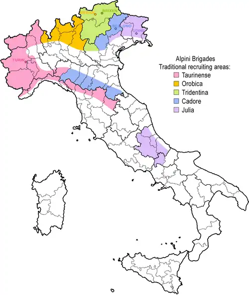 The Alpini are the Italian Army's specialist mountain infantry. Part of the army's infantry corps, the speciality distinguished itself in combat during World War I and World War II. Currently the active Alpini units are organized in two operational brigades, which are subordinate to the Alpine Troops Headquarters. The Alpini's name comes from their inceptive association with the Alps, the mountain range that Italy shares with France, Switzerland, Austria, and Slovenia. An individual soldier of the Alpini is called an Alpino.