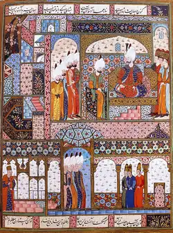 ![]() Alqas Mirza, at the court of Suleiman the Magnificent. Illustration from the Süleymanname (1558) | |