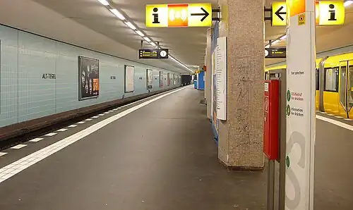 Alt-Tegel is a Berlin U-Bahn station located on the U6.t It was constructed by B. Grimmek and opened as "Tegel" station in 1958. In 1992, the station was renamed to Alt-Tegel (Old Tegel). The S-Bahn station Berlin-Tegel is located nearly 600 meters away. The renaming of the Tegel U-Bahn station perhaps occurred to avoid confusion.[2]