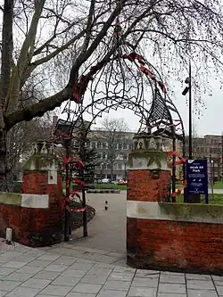 The park was renamed Altab Ali Park in 1998[4] in memory of Altab Ali, a 24-year-old British Bangladeshi leather clothing worker, who was murdered on 4 May 1978, in the adjacent Adler Street, by three teenage boys as he walked home from work.[5] Ali's murder was one of the many racist attacks that occurred in the area at that time.[6] At the entrance to the park is an arch created by David Petersen, developed as a memorial to Altab Ali and other victims of racist attacks. The arch incorporates a complex Bengali and European style pattern, meant to show the merging of different cultures in East London.[7][8][9]