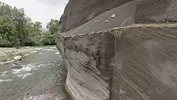 Much of the gravel deposited along the Katun valley lacks a stratigraphic structure, showing characteristics of a deposition directly after suspension in a turbulent flow.