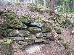 The medium-sized (ca. 115×150 metres) ringwork, which is assumed to date to the Early Middle Ages, is protected to the northeast and southeast by a steep slope and is surrounded by a sandstone wall, which has survived in places. This wall consists of dry sandstone ashlars and most of it is embedded in a rampart up to five metres high. A short section of the circular rampart in the south has been uncovered. There are also some well preserved sections of wall on the steep hillside.