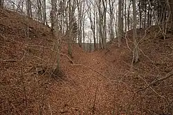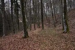 The tongue-shaped plateau of around 2 hectares is closed off towards the north east by two exterior ramparts, a deep moat and a large main rampart. Even today, the top of the main rampart is up to 12 meters above the bottom of the moat. Towards the valley the plateau is flanked by two terraces, 15 (north west) and 20 meters (south east) below the top. At the bottom of the slope another rampart and moat surround the hill. The entry to the fort was likely to the north east.[2]: 28