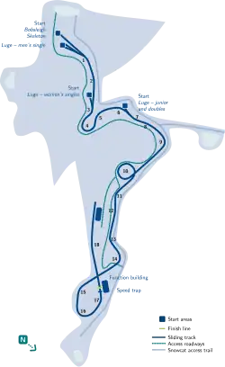 In 1997, the women's single luge start house was created before turn three after being shared with the men's double luge start house before turn seven from 1989 to 1996.[10] Women's skeleton first began competition in 1999 while women's bobsleigh first started the following year.[11][12][13] An 18th curve was modified during the summer of 2007 with the addition of a finish curve and straightaway.[14]