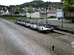 Students of the Kaiserslautern University of Technology proposed the establishment of a draisine operation on the Altenglan–Staudernhein section of the line to prevent its final closure and the dismantling of its track. The supporters of this project included a councillor of Kusel district, Winfried Hirschberg. After an examination of the draisine lines in Templin in Brandenburg—at that time the only one in Germany—and near Magnières in Lorraine, detailed planning began, which was implemented in 2000.[25] Since 2000 the Altenglan station of the southern starting point of the trolley route and, along with Lauterecken-Grumbach and Staudernheim, one of three stations offering trolley rentals.