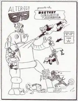The first issue of Alter Ego appeared in March 1961. Bails' wife Sondra typed out the contents, and the lettering was done with plastic lettering guides.[4] The 22-page issue featured three JSA-related articles, two columns, and an amateur comic strip: