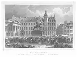 The government building consultants Vagedes and Götz submitted plans to build a new theatre building. The plans were rejected and it was decided to rebuild the Old Theatre. In 1831, the corresponding work was carried out on the old casting house. The construction costs amounted to 20,000 Taler. Finally, in 1832, a classicist portico with a tympanum on four Ionic columns was placed in front of the main façade according to a design by Anton Schnitzler, a student of Vagedes. Today, the entrance to the Council Hall of the City of Düsseldorf is located in this area.