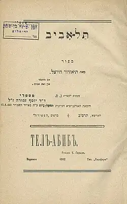 The Old New Land (German: Altneuland; Yiddish: אַלטנײַלאַנד, romanized: Altnayland) is a utopian novel published in German by Theodor Herzl, the founder of political Zionism, in 1902. It was published six years after Herzl's political pamphlet, Der Judenstaat (The Jewish State) and expanded on Herzl's vision for a Jewish return to the Land of Israel, which helped Altneuland become one of Zionism's establishing texts. It was translated into Yiddish by Israel Isidor Elyashev (Altnayland. Warsaw, 1902),[1] and into Hebrew by Nahum Sokolow as תֵּל־אָבִיב, Tel Aviv (Warsaw, 1902).[2] The name was adopted for the newly founded city of Tel Aviv.