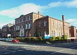 The facility has its origins in the Lloyds Fever Hospital established in Market Street in 1853.[1] It was completely rebuilt and reopened as the Altrincham Provident Dispensary and Hospital in 1870[2] before joining the National Health Service in 1948.[1] After services transferred to a modern community hospital on Railway Street,[3] Altrincham General Hospital closed in April 2015.[4] The site in Market Street was subsequently redeveloped to create a health and wellbeing centre as well as a new home for Altrincham Library.[5]