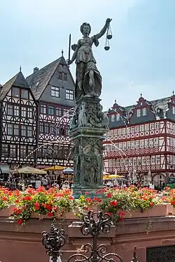 In the middle of the square is the Justice Fountain, which was built from sandstone in the 17th century. The construction was replaced in 1887 by a bronze replica. His name comes from the statue of Justitia that crowns him. In contrast to her depictions, Justitia was not blindfolded in Frankfurt. According to tradition, the fountain was fed with red and white wine at imperial coronations.