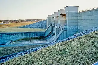On April 24, 1975, during a periodic inspection of the completed dam, the US Army Corps of Engineers expressed concern about the safety of the spillway monoliths. The rock underlying the dam is Ohio Black Shale which is a largely hard, massive silt shale. It is highly fractured below the base of weathering. Within this shale are several light gray, silty to clayey shale seams up to 1 ft (0.30 m) thick. It may be possible that the spillway monolith and its underlying bedrock could slide forward on one of these seams, opening a gap between the monolith and the rolled earth dam leading to rapid and catastrophic erosion of the dam.