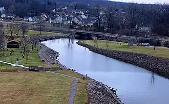 Alum Creek Dam was constructed between 1970 and 1974 on Alum Creek, a tributary of Big Walnut Creek, which drains into the Scioto River. The dam is a rolled earth-fill embankment 10,000 ft (3,000 m) in length with a maximum height of 93 ft (28 m). The spillway is located high on the right abutment with the raceway dropping off in front of it to the stilling basin below. Control is provided by three 34 ft (10 m) by 25 ft (7.6 m) tainter gates supported by 8 ft (2.4 m) wide concrete piers resting on concrete ogee sections. The ogee sections have a crest elevation of 878 feet (268 m) and are founded at 839 feet (256 m) elevation.