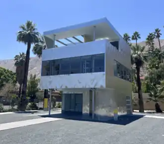 The property was subdivided by new buyers in the 1980s who planned to demolish the Aluminaire House. An attempt to designate the house as a landmark[4] failed, but the owners agreed to donate the house to the New York Institute of Technology, which reassembled the house on the school's Central Islip campus.[3][5][1] After the Central Islip campus was closed, the house was transferred to the Aluminaire House Foundation, disassembled, and put into storage. A 2013 proposal to reassemble the house on a site in Sunnyside Gardens, Queens, as part of a housing development, met with opposition from Sunnyside Gardens residents, who expressed concern that the house's design did not fit with the neighborhood's traditional brick housing.[6] In 2015, it was announced that the Aluminaire House would be moved to Palm Springs, California, home of other works by Frey.[7] In early 2018, the house was placed in a container and shipped to Palm Springs. Initial plans called for it to be rebuilt in a park opposite the Palm Springs Art Museum, pending a $475,000 fund raising effort for its restoration.[8] Assembly of the house at the museum was planned for 2021, but actually began in July of 2023, on a parking lot just south of the museum and with a budget of $2.6 million.[9][10] Because of its desert location, the museum added air conditioning and weatherproofing.[10] The grand opening was March 23, 2024.[11][10]