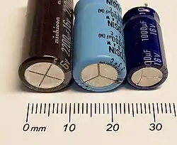 - ^ "Aluminum Electrolytic Capacitors FAQ". Rubycon Corporation. Archived from the original on 2016-03-03. Retrieved 2016-02-05.