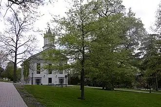 Alumni Hall, also known as Chapel Hall, is a historic multipurpose building located on the campus of Alfred University at Alfred in Allegany County, New York. It is a large frame structure built in 1851–1852 with what has been described as Alfred's most important Greek Revival features.[2] The three-story, 52-foot-wide (16 m) by 102-foot-long (31 m) rectangular structure has a red terra cotta roof. Designed and built by Maxson Stillman, it features a one of a kind 12 foot pine weathervane in the shape of a quill pen.[2] It was the fourth structure built for the Alfred Academy and housed a chapel, auditorium and lecture, recitation, library and lyceum rooms for college and community use.[3] It is now used primarily to house the Admissions Department.