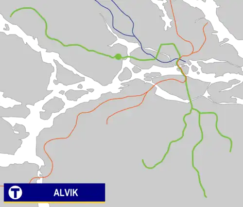 Alvik metro station is a station on the Green line of the Stockholm metro, and on the Tvärbanan and Nockebybanan lines of Stockholm tramways. It is located on the border between the districts of Traneberg and Alvik, which are part of the borough of Bromma in the west of the city of Stockholm. The station is one of the intermediate termini along the northern section of the Green line, with line 18 trains normally terminating, and is also the terminus of the Nockebybanan.[2][3]