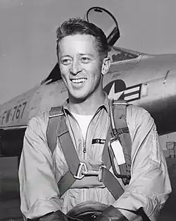 After the war, White completed his Bachelor of Science degree in mechanical engineering at the UC Berkeley in 1947, and went on to become an engineering test pilot for the U.S. Air Force and North American Aviation.[2] He participated in a variety of flight test programs over his career, including the F-86 Sabre jet, the F-100 Super Sabre series, the YF-107 and the X-15.[1] In 1958, White was selected for the U.S. Air Force's Man in Space Soonest manned spaceflight program. The program ended early due to financial and technical difficulties. In 1961, he was selected as chief test pilot for the flight test program of the XB-70 Valkyrie, the world's largest supersonic aircraft, piloting the first flights of both XB-70s and taking the aircraft through the buildup programs to flight at Mach 3.[1] On June 8, 1966, he was the sole survivor of the mid-air collision that destroyed the XB-70 #2 prototype and killed his co-pilot, USAF Major Carl Cross (1925-1966),[3] and noted aviator Joe Walker.[2] White ejected from the XB-70, sustaining serious injuries, including one arm being crushed as it was caught in the clamshell-like escape capsule as it closed around him just before ejection from the aircraft.[4]
