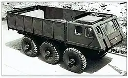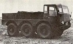 The Camion was a one off project vehicle that inspired the Stalwart; it was chassis number PV1. It consisted of an Alvis Salamander hull and cab, with the radiator still located in front of the rear mounted engine.[13]