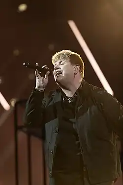For its Eurovision performance, the song itself was altered, with minor lyrical changes having to be implemented due to the European Broadcasting Union's ban on curse words in the Eurovision Song Contest.[25] Dan Shipton was appointed as the creative director for the performance, with additional assistance coming from Black Skull Creative, Shipton's company.[26] It featured Isaak wearing a black suit in a "stylish, sleek room" surrounded by flames during the beginning of the performance. Nearing the end of the performance, the set is removed for him to sing alone on stage.[27] Along with Isaak, four backing singers accompanied him on stage.[28] The song was performed in third, after Ukraine's duo of Alyona Alyona and Jerry Heil and before Luxembourg's Tali.[29] After the results were announced, he finished in 12th with 117 points, with a split score of 99 points from the juries and 18 points from televoting.[30] No country gave the maximum 12 points in either category; Israel gave the highest amount for both sets, allocating 10 jury points and eight televoting points for the entry.[31]