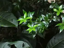 Alyxia oblongata is an evergreen shrub growing up to 3 m (9.8 ft) high.[4] The dark glossy green leaves are borne in whorls of three or four on the twigs, and measure about 3.5 by 1 cm (1.38 by 0.39 in).[4] They are elliptic with a sharp, rigid tip and have up to 20 lateral veins.[4]