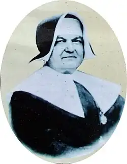 The delay gave General Castelnau time to prepare his counter-offensive on Rozelieures, the first French victory of the war.[4] Sister Julie was cited in an Army order.[2] President Raymond Poincaré visited Gerbéviller on 29 November 1914.[4] On 2 December he spontaneously awarded "the nurse of the hospital-ambulance of Gerbéviller" the Legion of Honour.[4][3] She was confirmed as a knight of the Legion of Honour by decree of 9 January 1915.[1] Sister Julie was given much publicity in journals, with photographs and postcards.[2] For example, one postcard depicted her preventing a German soldier from killing a wounded man. In the picture she has been made to look young and pretty.[3] After the war she remained at the hospice until her death in May 1925, aged 71.[2]