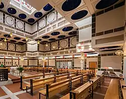A stairway leads from the rooms on the ground floor to a central vestibule through which the church proper is accessible. This consists of a central space, with room for 220 people seated and 400 standing, in the shape of a Greek cross surrounded by an ambulatory delineated by concrete pillars. The cubic elements, which draw together in this space, terminate at the apex of the pyramid in a lantern of glass windows. The white interior, highlighted by green and golden ceramic tiles, is strongly reminiscent of the Jugendstil.