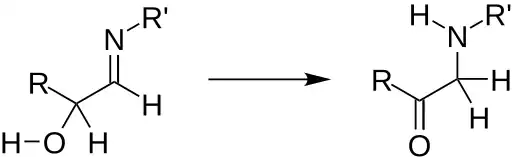 The rearrangement is usually preceded by formation of a α-hydroxyimine by condensation of an amine with an aldose sugar. The rearrangement itself entails intramolecular redox reaction, converting this α-hydroxyimine to an α-ketoamine: