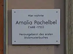 A commemorative plaque installed on a house in Erfurt where the Pachelbel family lived mentions her as the "author of the first embroidery pattern (formula) textbook". A previous version of the plaque had two mistakes.