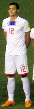 Aguinaldo was a member of the Philippines' squad at both the 2014 AFC Challenge Cup and the 2014 AFF Championship, reaching the finals and semi-finals respectively in each competition.[14] During the latter tournament Aguinaldo was involved in a fair bit of controversy in the first leg of the semi-final as Thai striker Adisak Kraisorn was sent off for an off the ball altercation with the Filipino defender.[15] It appeared that Aguinaldo might have provoked the confrontation and afterwards he and other Filipino footballers received threats from Thai fans.[16]