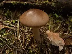 The smooth cap is hemispherical when young and later flat, sometimes with grey patches of veil.[6][7] It is about 4–10 centimetres (1+1⁄2–4 inches) in diameter,[8][9][7] and brown with either a purplish or a greyish hue.[8][10][7][6][11] As is normal in the genus, the gills are whitish and free from the stem and the spores are white. The gills darken when bruised.[12]