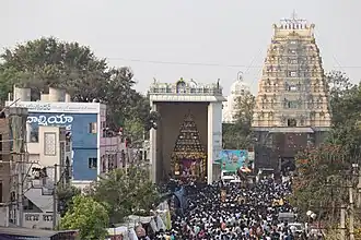 Built in the Dravidian architectural style, the temple features four gopuras and a central vimana.[3] It is a significant spiritual and historical site, drawing pilgrims from across the region. Major festivals, such as Maha Sivaratri and Navaratri, are celebrated here.[5] The temple is located on Krouncha Saila, a small hill near the Krishna River, and the surrounding village of Amaravathi is named after it.[6] This village also inspired the name of Andhra Pradesh's planned capital, Amaravati, located 35 kilometers to the east.[7]