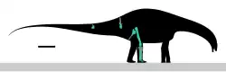 As a dicraeosaurid, Amargatitanis would have resembled better known members of the family such as Dicraeosaurus and Amargasaurus, which had shorter necks than most other sauropods and long neural spines extending from the vertebrae of the neck and trunk.[8] It was a small sauropod,[9] with one study estimating its mass at 11.406 metric tons (12.573 short tons), slightly larger than the same study's estimate for Amargasaurus of 10.195 metric tons (11.238 short tons).[10] Mass estimates for Amargasaurus have been noted to vary widely depending on the method used,[11] and studies using other methods, not yet applied to Amargatitanis, have found Amargasaurus to weigh 3.304 metric tons (3.642 short tons)[12] to 4.376 metric tons (4.824 short tons).[13]