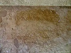 Fifty-nine instances of Greek graffiti have been scratched into the lower plaster of the tomb's corridors.[8] The graffiti was discovered in 1835 by Sir John Gardiner Wilkinson.[3] Barry Kemp, the Director of Excavations at Amarna, has stated that this graffiti can be dated to the Ptolemaic Period.[20] The graffiti records the messages and names of the tomb's visitors, most of which are presumed to have been soldiers. A graffito in the corridor records a message from a Greek visitor; “I come. Year 37”.[3] The most well-known Greek graffito from the tomb is located next to the exterior door frame of the tomb. The inscription reads: “having ascended here, Catullinus has engraved this in the doorway, marvelling at the art of the holy quarriers”.[3] This graffito provides insight into later Greek perspectives on the art, technology and architecture of the Ancient Egyptians. Another message is a Coptic Christian graffito, providing evidence for the coptic occupation of the site.[21] Coptic Christians coopted the site of the North Tombs in the fifth and sixth centuries AD.[20] They inhabited the tomb of Ahmose, as evidenced by two low exterior walls which were built by later settlers.[22]