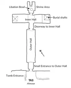 Amarna Tomb 3 is a symmetrical cruciform plan tomb consisting of two rectangular halls and a shrine.[5] The sepulchre is located a short distance from the Tomb of Meryra, a High Priest. The entrance to the tomb looks on to the south-western part of the Amarna plains. The facade of the tomb consists of a simple doorframe of recessed rock which is decorated with hymns and prayers to the god Aten.[8] A three-sided, walled, brick courtyard is located at the front of the tomb's entrance.[5] The lintel and jambs of the exterior door contain prayer inscriptions to the Pharaoh Akhenaten.[9] After passing through the doorway, a smaller decorated entrance leading towards the outer hall is reached. Remnants of colour indicate that painted designs once adorned the ceiling and walls of this entryway.[3] The outer hall consists of a deep rectangular chamber with plastered walls and a vaulted roof.[8] A corniced doorway leads towards the inner hall. The inner hall is positioned at a right angle to the outer hall, containing two burial shafts at either end. The first burial shaft measures approximately thirty feet deep.[8]