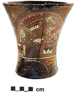 In mythology of Andean civilizations of South America, the amaru or katari (aymara) is a mythical serpent or dragon. In Inca mythology, Amaru is a huge double-headed serpent that dwells underground, at the bottom of lakes and rivers.[1] Illustrated with the heads of a bird and a puma, Amaru can be seen emerging from a central element in the center of a stepped mountain or pyramid motif in the Gateway of the Sun at Tiwanaku, Bolivia. When illustrated on religious vessels, amaru is often seen with bird-like feet and wings,[2] so that it resembles a dragon. Amaru is believed to be capable of transcending boundaries to and from the spiritual realm of the subterranean world.[2]