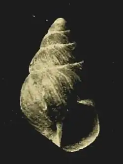 (Original description) The shell is openly perforate, dextral, thin, and fragile, with a pale brownish-white appearance in its fossilized state. The whorls of the protoconch are minutely but distinctly striated and convex. Subsequent whorls are also convex, sharply and irregularly sculptured with growth wrinkles that become progressively coarser with each successive whorl. The sutures are relatively deep.