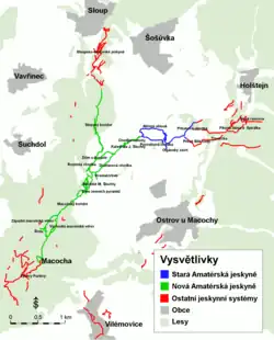 The history of explorations of the entire system already began in the early 18th century. Already in 1723 Lazarus Shopper realised the first descend into Macocha Abyss. In 1800 a first map of the Sloupské Caves (the small lateral part of whole system only) was created. Systematic research began in the second half of the 19th century, when Dr.Jindrich Wankel and Martin Kriz published the first scientific studies of the Northern Part of Moravian Karst. Prof. Karel Absolons was the first to define a theoretical connection between the Sloupsko-sosuvske Caves, Nova Rasovna cave and Macocha gorge at the beginning of the 20th century. He spent his whole life working on the clarification of this speleological problem. He only partly succeeded, but Amaterská Cave as a main key to this problem was explored in 1969 by the Planivy Caving Club. In 18. January 1969 were main part of Amatérská Cave (Stará-The old) discovered. Catastrophic stormwater flooding 29. 8. 1970 and the deaths of amateur speleologists Milan Šlechta and Marko Zahradníček after, gave name the cave. Within a short period of time, corridors connecting caves from a water sink in Nova Rasovna up to the resurgence in Punkevni cave were explored. The last unfinished part between Amaterska cave and the Sloupsko-sosuvecke Caves remained unexplored until 2005.[3]