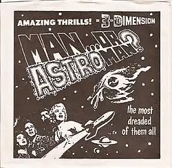 Amazing Thrills! in 3-Dimension is a Man or Astro-man? promo 7" that was given away with the first 1,000 copies of their debut album, Is It ... Man or Astroman?.[1] It was released on Estrus Records in 1993 on black vinyl only.[2] By some counts, 1,000 copies is a generous estimate, as the Estrus website places the actual number pressed as only 400 (200 given to the band and 200 distributed to the first 200 people to order the first LP directly from Estrus).[3] This is the first time Man or Astro-man's cover of the Mystery Science Theater 3000 theme song was released. It was later re-released on Destroy All Astromen!.