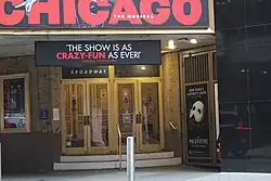 Relatively few productions have played the Ambassador since 2000.[7][13] The first was The Ride Down Mt. Morgan, which was staged in 2000.[208][209] The next year, the Ambassador hosted A Class Act[210][211] and Hedda Gabler,[212][213] the latter of which opened during a downturn in the Broadway industry caused by the September 11 attacks.[214] The play Topdog/Underdog opened at the Ambassador in 2002.[215][216] This was followed by the musical Chicago, which had already run for several years on Broadway when it transferred to the Ambassador in January 2003.[217] Chicago has played at the Ambassador ever since,[218] becoming the second-longest-running Broadway production in 2014.[219][c] As part of a settlement with the United States Department of Justice in 2003, the Shuberts agreed to improve disabled access at their 16 landmarked Broadway theaters, including the Ambassador.[220] The theater closed on March 12, 2020, due to the COVID-19 pandemic.[221] It reopened with performances of Chicago on September 14, 2021.[222] Chicago broke the theater's box-office record several times during its run, most recently during the week ending January 1, 2023, when the musical grossed $1,299,400.[223]