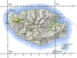 The island is of volcanic origin, and is composed of Cenozoic sedimentary rocks. The relief is mostly mountainous, with the highest points at 608 m (Mt. Baula) and 559 m (Mt. Nona) in the western area.[4] The island rises vertically from the sea, and flat parts are found only on the southern and eastern coasts. Much of the territory, especially in mountainous areas, is covered with wet tropical forests.[5] The island is located in a seismically active zone with frequent earthquakes; two significant recent earthquakes occurred in August 2006[6] and January 2016 when eight people were hurt and about 120 houses were damaged in two villages.[7] Flora and fauna of the island are diverse and are similar to that of Buru. There are abundant coral reefs off the coast of Ambelau.[5]