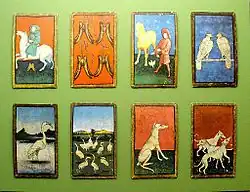 The Ambraser Hofjagdspiel (Court Hunting Pack of Ambras; sometimes the Ambras falconer cards[1] or the Courtly Hunt Cards[2][3]) is a pack of cards painted around 1440–1445 and attributed to the engraver Konrad Witz from Basel, Switzerland.[4] It originally consisted of fifty-six cards from which only 54 survive, all distributed in four suits, falcons, lures, hounds and herons, symbols related to hunting.[4] Each suit contained ten pip cards with the 10s being represented by a banner like many old German playing cards and modern Swiss playing cards. There are four face cards per suit: the Unter, Ober, Queen, and King. It was found in a collection at the Ambras Castle, in Innsbruck, Austria, in the 16th century, and now figures as a precious item in the collection of cards of the Kunsthistorisches Museum (Museum of Art History) in Vienna.[5]