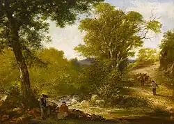 Johns and Turner's styles were similar and Johns made a painting box by hand for his sketching partner. There are examples in John's sketchbooks of studies he made based on Turner's work.[2] This friendship was damaged when a painting by Johns, that was owned by the influential art critic Samuel Carter Hall, was engraved and published and erroneously attributed to Turner. The publishers did print a correction and apology in the newspapers but this still did not prevent the same painting being sold at Christie's still with an incorrect attribution to Turner. Johns exhibited at prestigious exhibitions in London including the Royal Academy. Despite this exposure his work was later confused with Turner's on two other occasions.[1] Turner is said to have "tired of Johns' copying" although they were still acquaintances in 1840.[2]