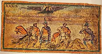 The Ambrosian Iliad or Ilias Picta (Milan, Biblioteca Ambrosiana, Cod. F. 205 Inf.) is a 5th-century illuminated manuscript on vellum, which depicts the entirety of Homer's Iliad, including battle scenes and noble scenes. It is considered unique due to being the only set of ancient illustrations that depict scenes from the Iliad. The Ambrosian Iliad consists of 52 miniatures, each labeled numerically. It is thought to have been created in Alexandria, given the flattened and angular Hellenistic figures, which are considered typical of Alexandrian art in late antiquity,[1] in approximately 500 AD, possibly by multiple artists. The author(s) first drew the figures nude and then painted the clothes on, much like in Greek vase painting.[2] In the 11th century, the miniatures were cut out of the original manuscript and pasted into a Siculo-Calabrian codex of Homeric texts.